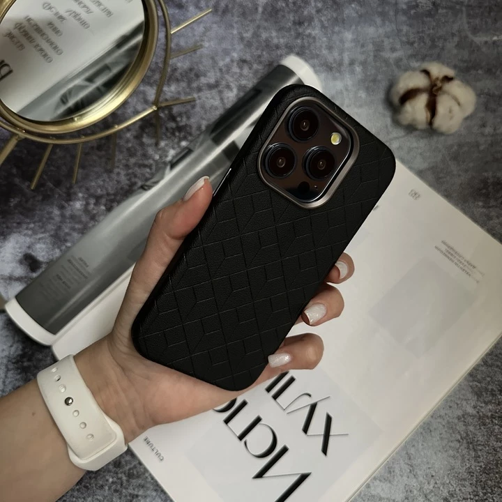 Шкіряний чохол з перфорацією, підтримує бездротову зарядку MagSafe. Декорований металевими кнопками та рамкою навколо камери. Текстильна підкладка в середині забезпечує максимально комфортний захист. Борти виступають над екраном та камерою. Елегантний вигляд на надійний захист вдало поєднуються в одній моделі.