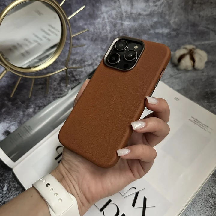 Шкіряний чохол Modern Leather Каркас корпусу з полікарбонату максимально прилягає до телефону. Приємне на дотик зовнішнє шкіряне покриття забезпечує комфортне користування. Декорований металевими кнопками та рамкою біля камери. Підтримує бездротову зарядку MagSafe.