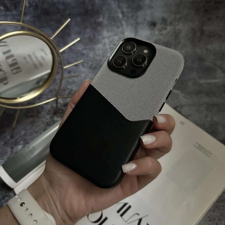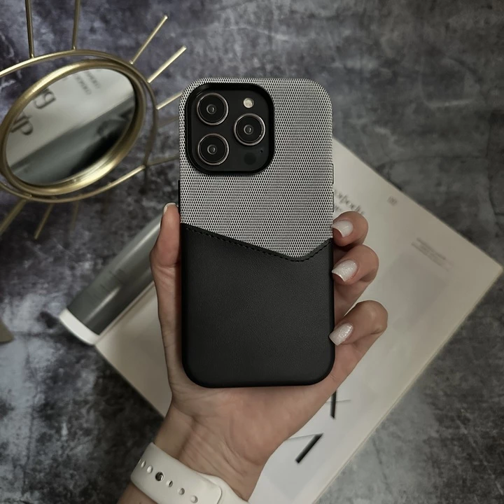 Шкіряний чохол з картхолдером та підтримкою MagSafe. Преміальне поєднання конопляної тканини та шкіри. Твердий надійний корпус. Текстильна середина допомагає максимально зберегти цілісність телефону. Декорований металевими кнопками та рамкою біля камери. Функціональна кишеня для карт на корпусі вдало доповнює унікальний дизайн.