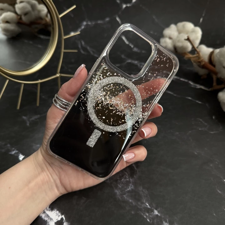 Силіконовий напівпрозорий чохол виготовлений з твердого ударостійкого полікарбонату та силіконових бортів. Камера відкрита, проте захищена виступом бортів на 1,5 мм над рівнем камери. Виступ бортів над екраном 2,5 мм, що дозволяє зберегти його цілісність від подряпин. Підтримка MagSafe декорована мікроблискітками. Дизайн корпусу оформлено чорним кольором та блискучими елементами. Яскравий та надійний захист твого телефону.