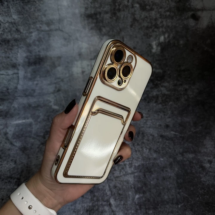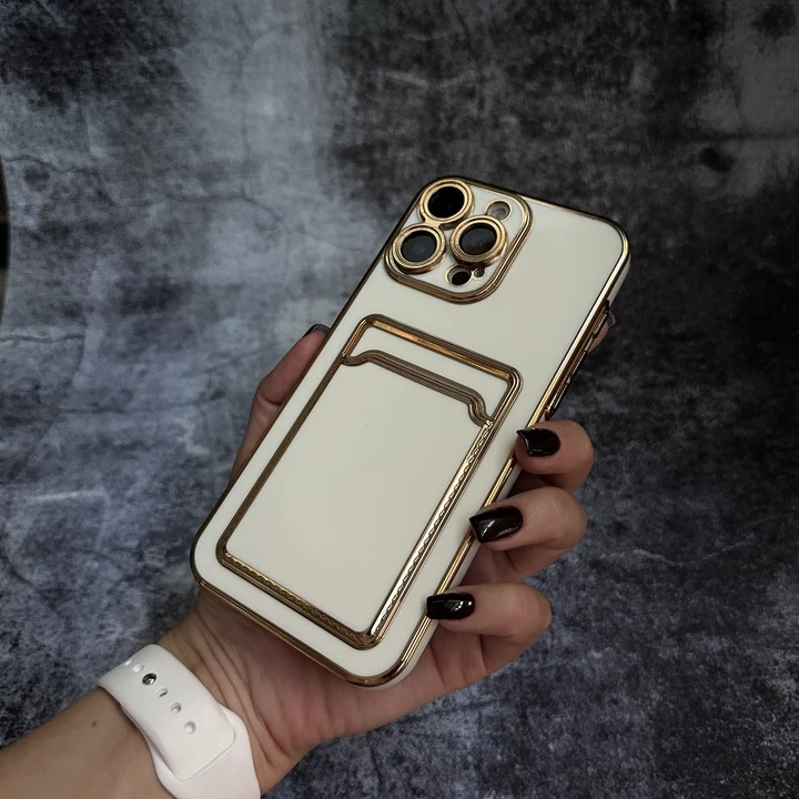 Глянцевий силіконовий чохол з захистом камери, без скляних лінз. Повністю повторює форму IPhone та не збільшує його габарити. Цікавим елементом є кишеня картхолдер, яка робить використання чохла ще більше функціональним. Золоті елементи декору роблять вигляд вашого телефону унікальним.