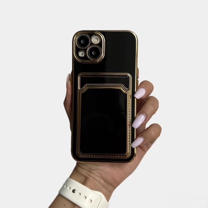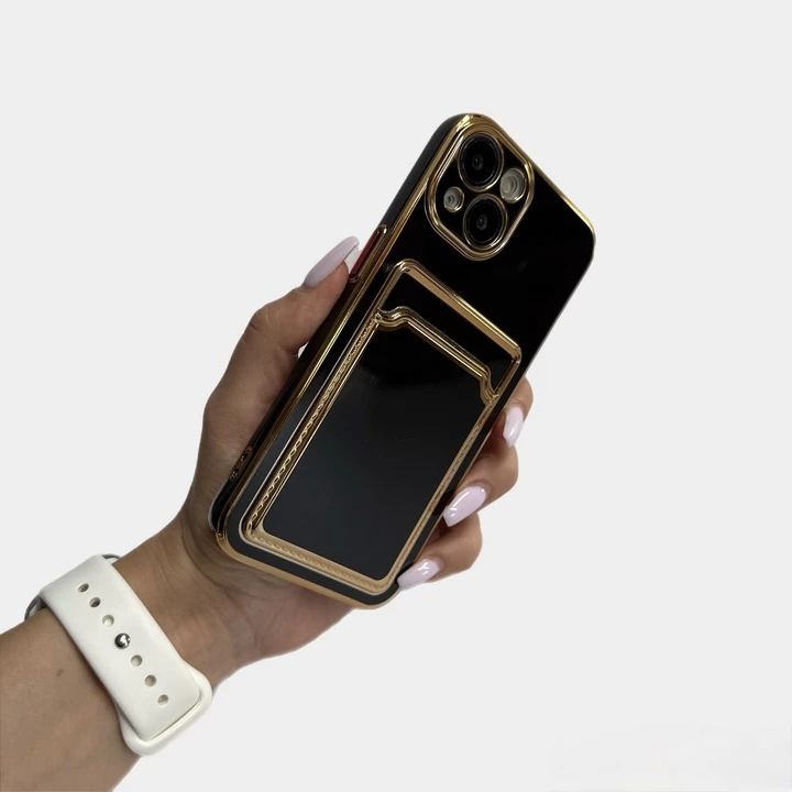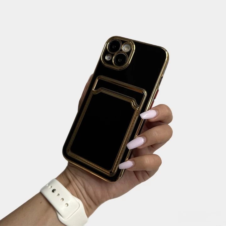 Глянцевий силіконовий чохол з захистом камери, без скляних лінз. Повністю повторює форму IPhone та не збільшує його габарити. Цікавим елементом є кишеня картхолдер, яка робить використання чохла ще більше функціональним. Золоті елементи декору роблять вигляд вашого телефону унікальним.