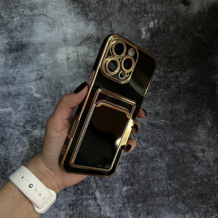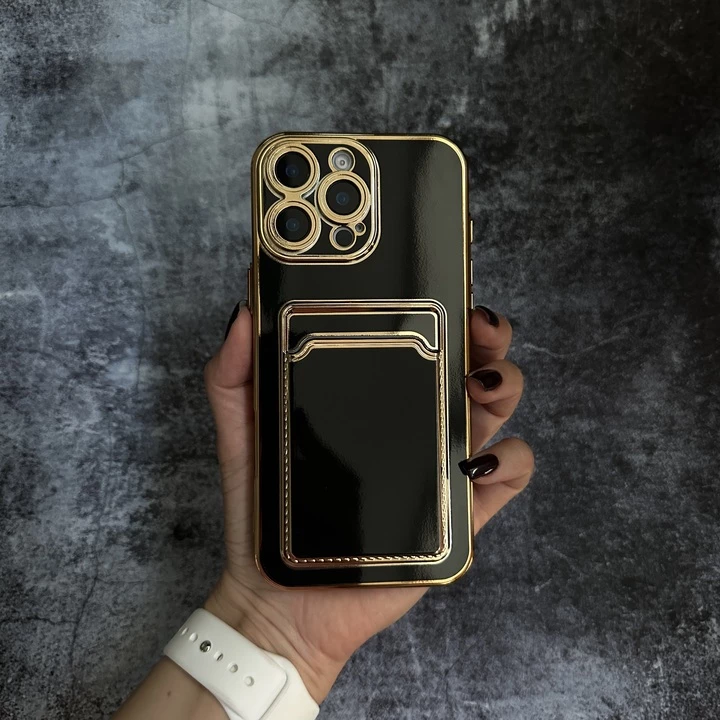 Глянцевий силіконовий чохол з захистом камери, без скляних лінз. Повністю повторює форму IPhone та не збільшує його габарити. Цікавим елементом є кишеня картхолдер, яка робить використання чохла ще більше функціональним. Золоті елементи декору роблять вигляд вашого телефону унікальним.