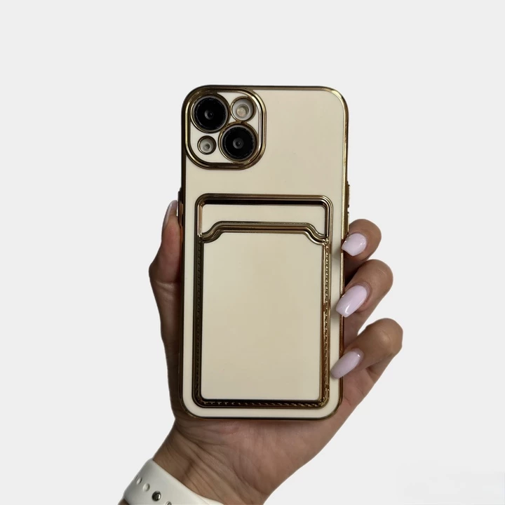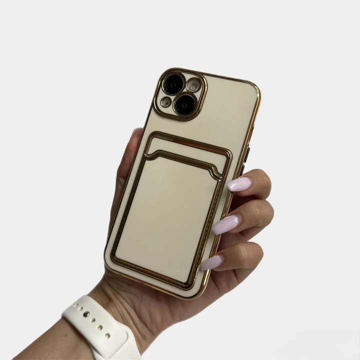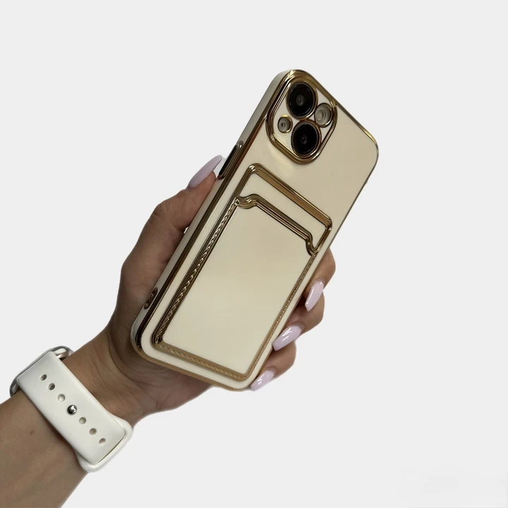 Глянцевий силіконовий чохол з захистом камери, без скляних лінз. Повністю повторює форму IPhone та не збільшує його габарити. Цікавим елементом є кишеня картхолдер, яка робить використання чохла ще більше функціональним. Золоті елементи декору роблять вигляд вашого телефону унікальним.