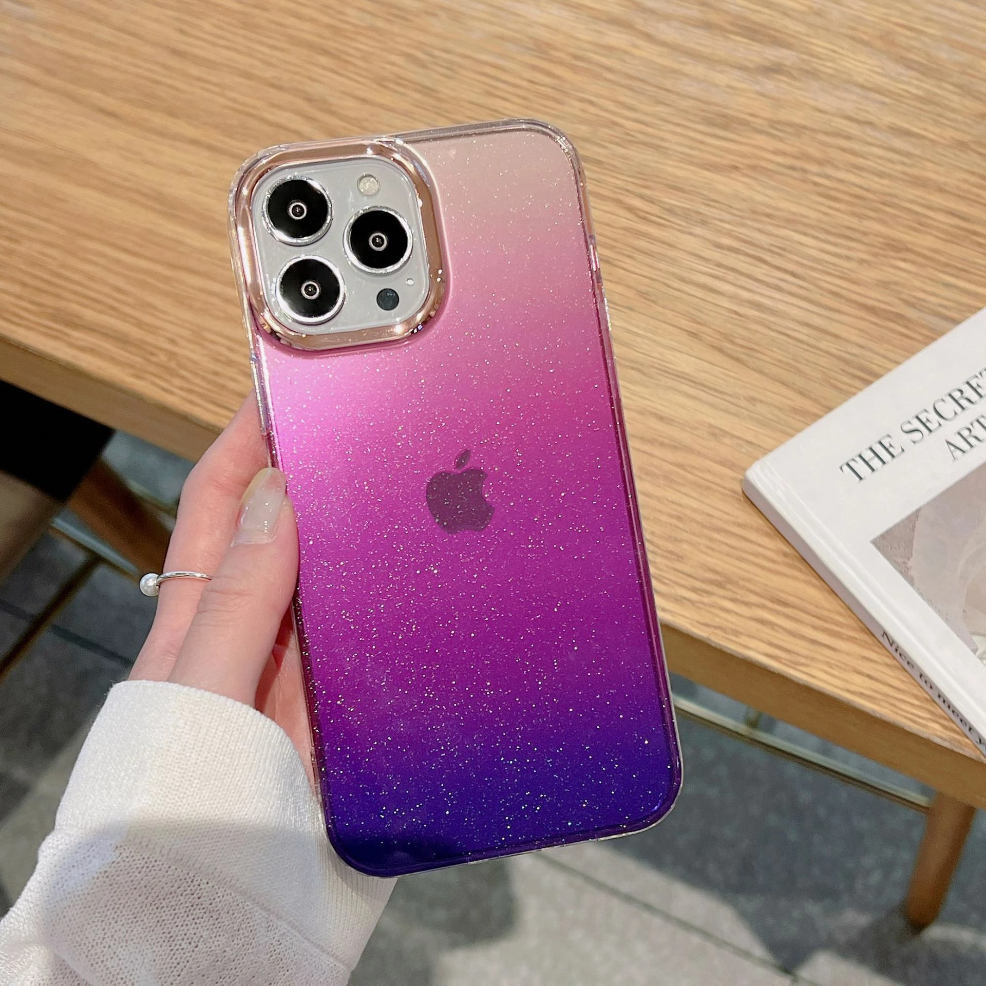 Міцний акриловий напівпрозорий чохол. Корпус виконаний з міцного полікарбонату, а борти- силікон. Задня кришка переливається сяйвом мікроблискіток, а колір корпусу гармонійно переходить від світло відтінку до більш насиченого, створюючи ефект омбре. Камера відкрита, проте захищена виступаючим золотим бортом по периметру неї.
